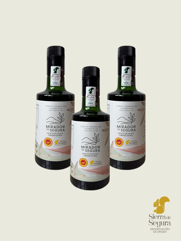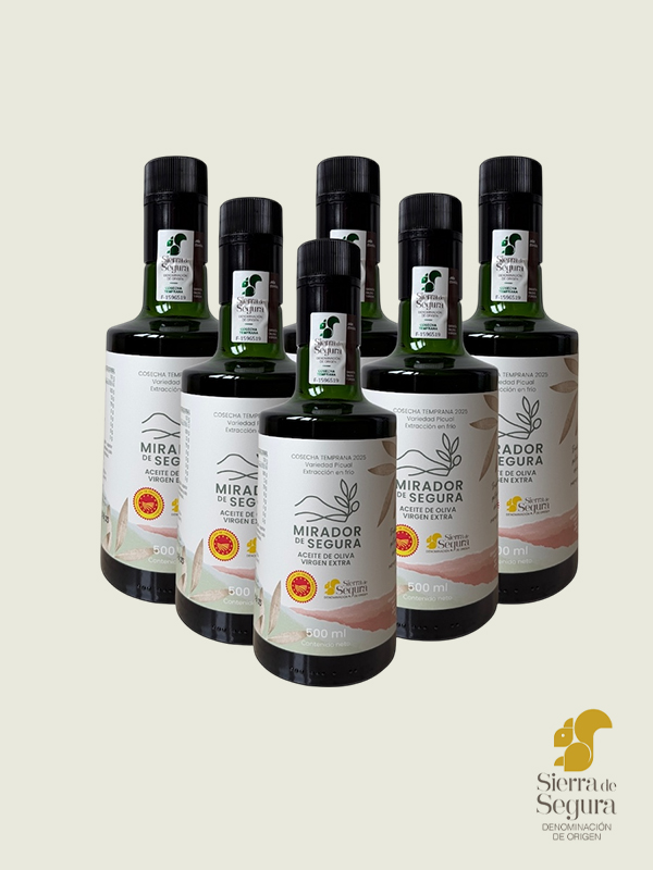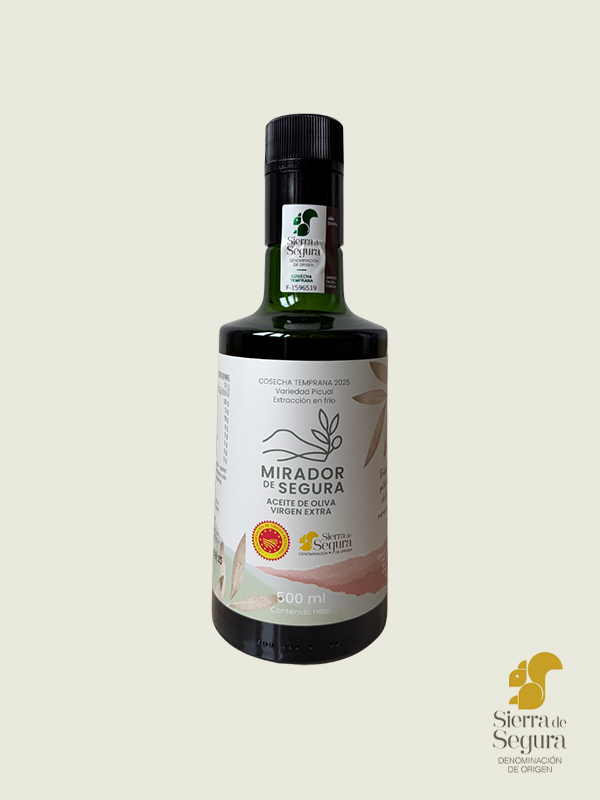 Nuestro aceite está amparado por la Denominación de Origen Sierra de Segura, un sello que garantiza su origen auténtico y excelencia. Cada botella de Mirador de Segura lleva su correspondiente contraetiqueta numerada con el símbolo de la ardilla, emblema de la Denominación, como muestra de que ha superado los más estrictos controles de calidad.