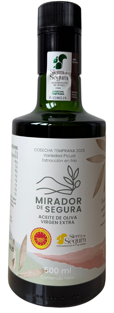 Nuestro aceite Mirador de Segura cuenta con la Certificación de Recolección Temprana, que asegura que nuestro AOVE se obtiene de aceitunas verdes o en envero, recolectadas siempre antes del 30 de noviembre, momento en el que el fruto ofrece su máxima riqueza en aroma, sabor y antioxidantes naturales. En 2025, la recolección se ha realizado entre el 9 y el 12 de octubre.
